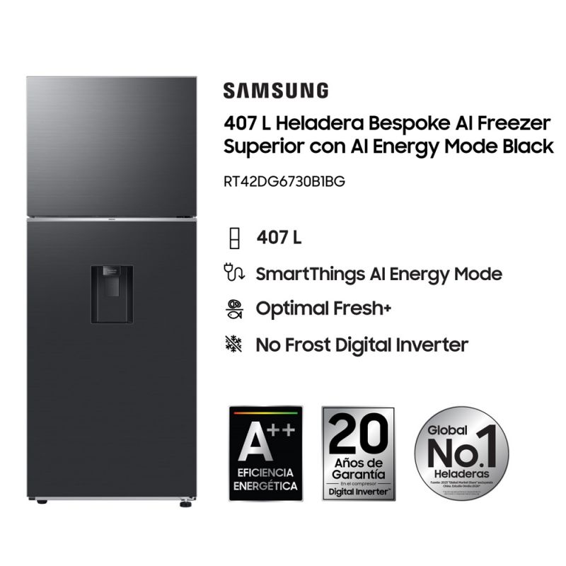 Características Adicionales Modo AI Energy en SmartThings Energy: Reduce el consumo de energía optimizando la velocidad del compresor / Cajón Optimal Fresh+ / Diseño plano, limpio y contemporáneo / Tecnología exclusiva SpaceMax™