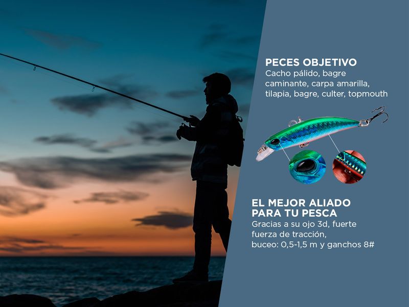 Amantes de la pesca, les presentamos un producto que les encantará. Este cebo artificial ha sido diseñado para imitar a la perfección los movimientos de un pez, atrayendo así a los peces depredadores y aumentando las posibilidades de éxito en su pesca.