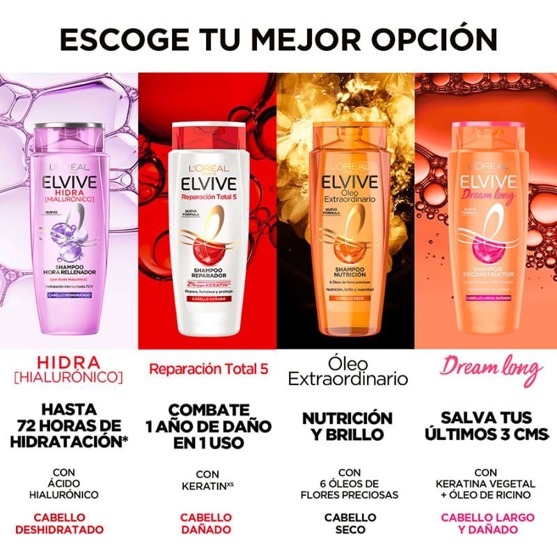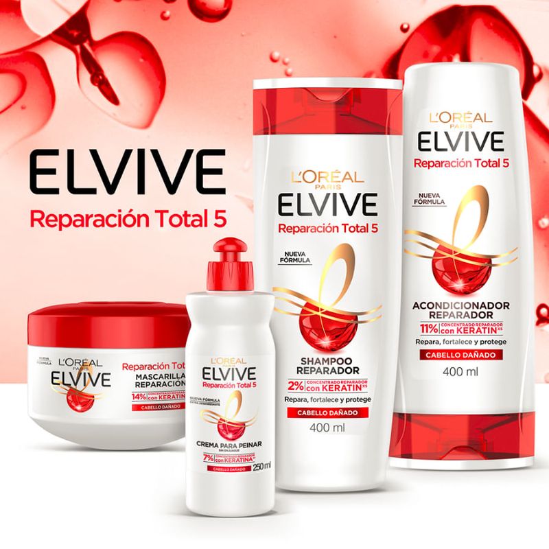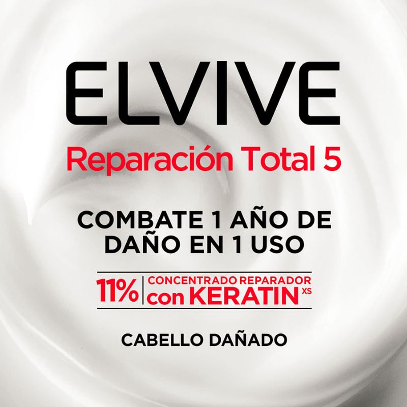 Elvive Reparación Total 5 para cabello dañado tiene como beneficio 1 SOLUCIÓN PARA REPARAR 5 SIGNOS DEL CABELLO DAÑADO: