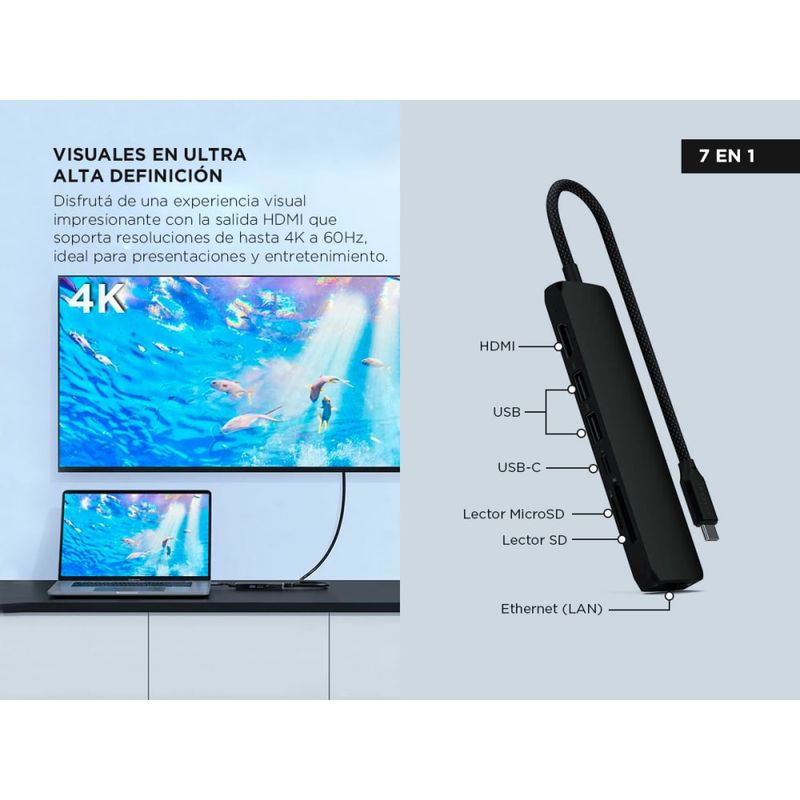 Transformá tu único puerto USB-C en una potencia con múltiples conexiones. Este adaptador incluye un puerto Ethernet, salida HDMI 4K a 60 Hz, carga USB-C PD (100 W), lector de SD y Micro SD, y dos puertos USB-A, que ofrecen una amplia gama de opciones de conectividad para todos tus dispositivos.