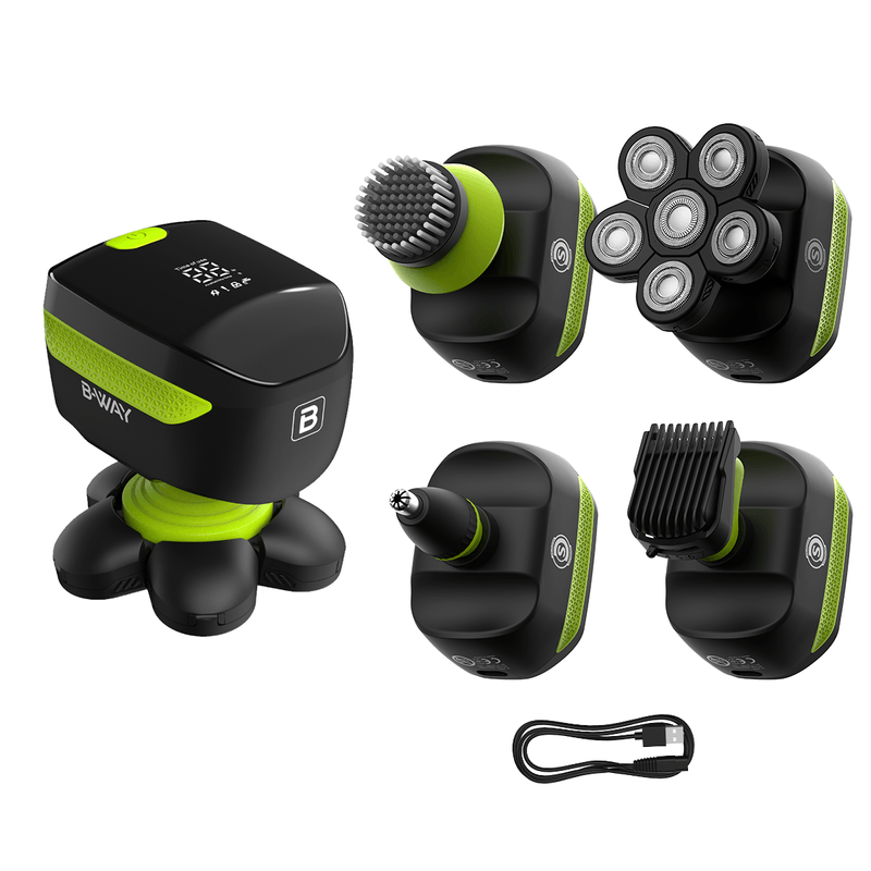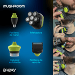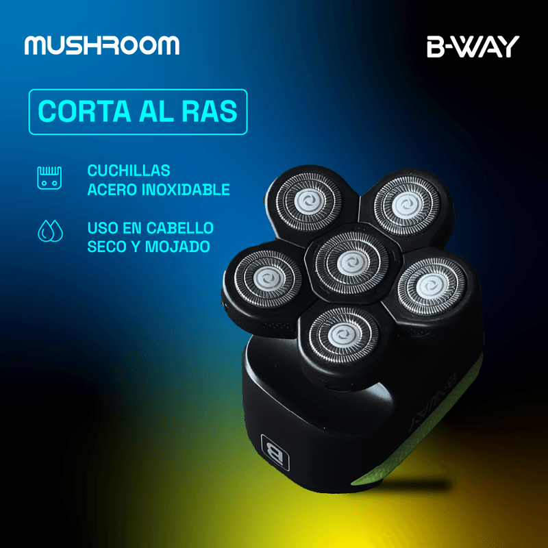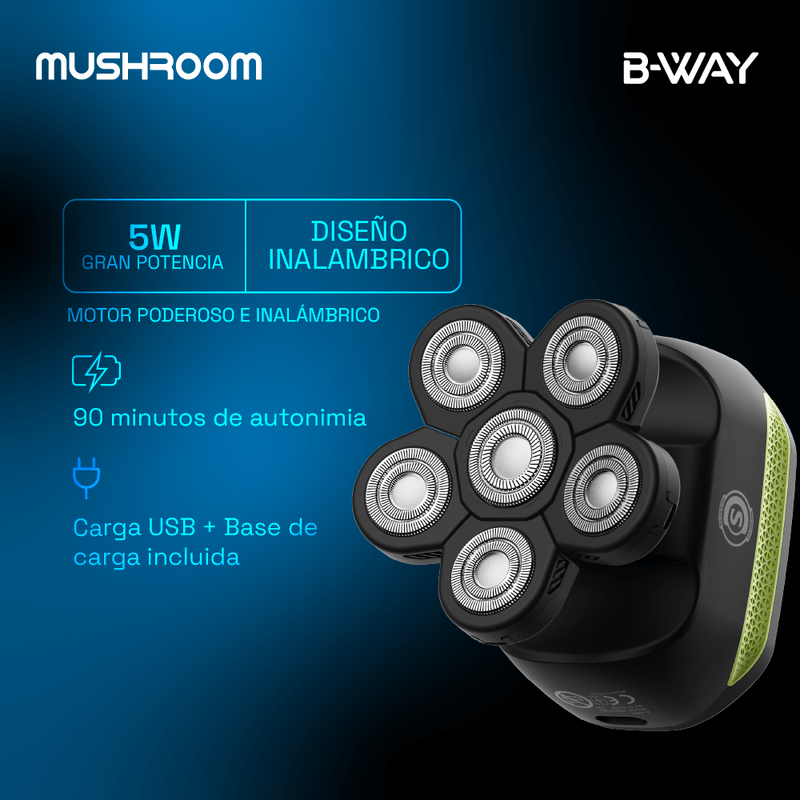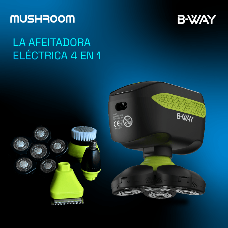Afeitadora multifuncion BWAY Mushroom 4 en 1 disenada para afeitar recortar perfilar y eliminar vello de nariz y orejas con precision y comodidad. Su diseno ergonomico tipo mushroom la hace liviana y facil de maniobrar. Funciona de manera inalambrica y recargable por USB con bateria de larga duracion de hasta 90 minutos. Los cabezales son intercambiables y lavables rotativo flotante que se adapta a los contornos corte de precision para patillas cuello y barba y trimmer para nariz y orejas. Incluye afeitadora 4 cabezales cable USB y cepillo de limpieza. Beneficios herramienta practica y versatil ideal para cuidado diario y resultados prolijos en poco tiempo. Garantia oficial de 6 meses y servicio tecnico especializado con repuestos originales
