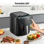 Su diseño moderno y compacto (291 x 335 x 365 mm) se adapta fácilmente a cualquier espacio de cocina. La pantalla táctil LED intuitiva te permite ajustar el tiempo y la temperatura con facilidad, haciendo que cocinar sea más simple y eficiente.
