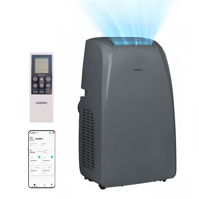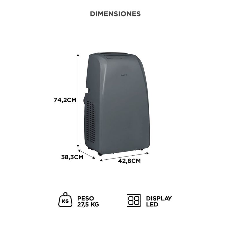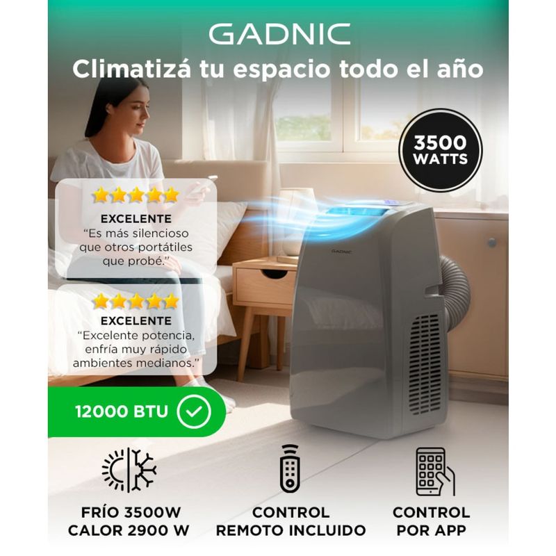 • Incluye accesorios completos (mangueras, adaptador, sellado de ventana), ruedas 360° para fácil movilidad y alarmas de seguridad.