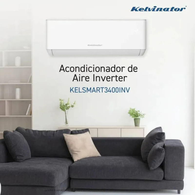 Aire Acondicionado Split Kelvinator. Modelo: KELSMART3400INV. Aire Acondicionado Split Frio Calor. Capacidad de Refrigeración: 3400 W. Capacidad de Calefacción: 3300 W. Capacidad de Operación: En modo refrigeración, el equipo tiene una capacidad de 3,40 kW (3.400 Watts), mientras que en modo calefacción alcanza los 3,30 kW (3.300 Watts). El consumo de energía anual estimado es de 260 kWh para refrigeración y de 457 kWh para calefacción, dependiendo siempre del clima y del uso efectivo. Tecnología Inverter (Ahorro de hasta un 35-50% de energía). Tipo de Gas: R410A (Ecológico, no daña la capa de ozono). Tecnología Inverter: A diferencia de los equipos On/Off, el compresor varía su velocidad para mantener la temperatura constante. Esto evita picos de consumo y hace que el equipo sea mucho más silencioso. Función I Feel: El control remoto tiene un sensor térmico. Si activás esta función, el equipo ajusta la temperatura basándose en la ubicación del control, asegurando que el frío/calor llegue exactamente donde estás sentado. Filtros Lavables: Incluye un sistema de filtrado básico diseñado para retener partículas de polvo, mejorando la calidad del aire ambiente. Modo Sleep: Ajusta la temperatura de forma gradual durante la noche para que no te despiertes por exceso de frío o calor, optimizando el descanso.