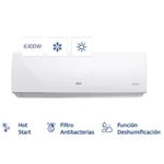 AIRE SPLIT FRIO CALOR BSH65WCU 6400W BGH -Capacidad Frío 6300 W -Capacidad Calor 6400 W -Potencia Eléctrica Frío 1960 W -Potencia Eléctrica Calor 1775 W -Intensidad de la corriente Frío 9,10 Amp -Intensidad de la corriente Calor 8,20 Amp -Eficiencia Energética Frío A -Eficiencia Energética Calor A -IEEE: Indice de eficiencia energética estacional (W/W) 3,40 -COP: Coef. de performance (W/W) 3,61 -Nivel de ruido Interior Alto 45 dB -Nivel de ruido Interior Bajo 42 dB -Nivel de ruido Exterior 55 dB -Control Remoto con LCD -Filtro antipolvo -Función Inteligente -Función Sueño -Hot Start -Timer programable de 24 hs -Función deshumidificación -Auto restart -Medida de caños (alta - baja) 1/4 y 5/8 -Medidas Unidad Interior (A x Al x P) 1100x325x244 mm -Medidas Exterior (A x Al x P) 860x650x310 mm -Peso neto Unidad Interior 14,5 kg -Peso neto Unidad Exterior 47 kg -Unidad Interior (A x Al x P) 1170x390x315 mm -Unidad Exterior (A x Al x P) 995x720x420 mm -Peso bruto Unidad Interior 17 kg -Peso bruto Unidad Exterior 51 kg -Modelo BSH65WCU -Garantía fabricante 12 meses -País de origen Argentina