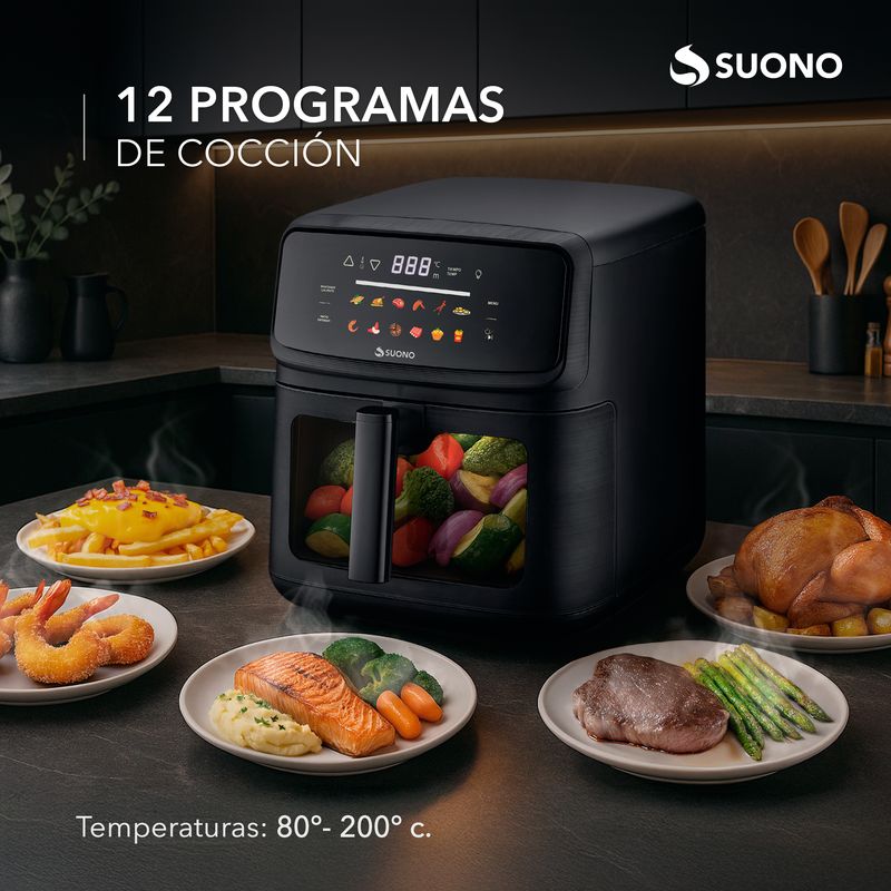La AirFryer Digital Suono de 10 litros es el electrodoméstico ideal para quienes buscan cocinar de forma más saludable y práctica. Con su sistema de convección de aire caliente y doble resistencia, asegura una cocción más rápida, uniforme y con menos aceite, logrando platos crocantes por fuera y jugosos por dentro. Su gran capacidad de 10L la hace perfecta para familias o reuniones, permitiéndote preparar desde papas fritas hasta carnes, pescados y postres.