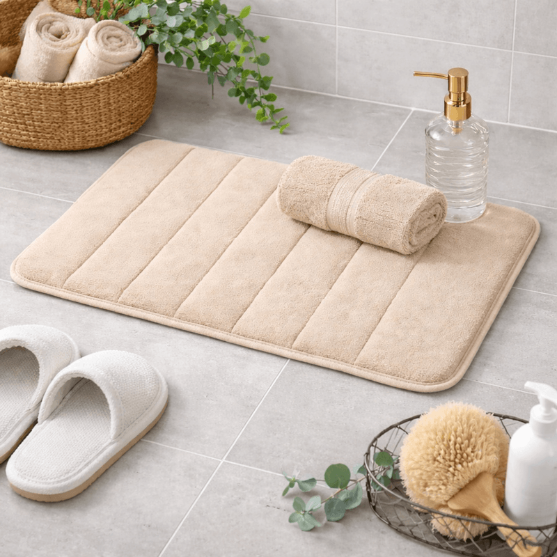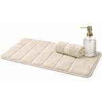 Alfombra de baño con relleno de espuma que brinda confort y gran absorción a la humedad. Cubierta de microfibra extra suave con memoria, esto significa que al pisarla se hunde y luego vuelve a su estado original. Base antideslizante. Medida: 40x60 cm. También incluye una toalla de mano de 28cm x 43 cm.de 400 gramos 100% algodón. . Además incluye un dispenser de vidrio de jabón. Colores disponibles: azul, beige, gris (sin elección de color).