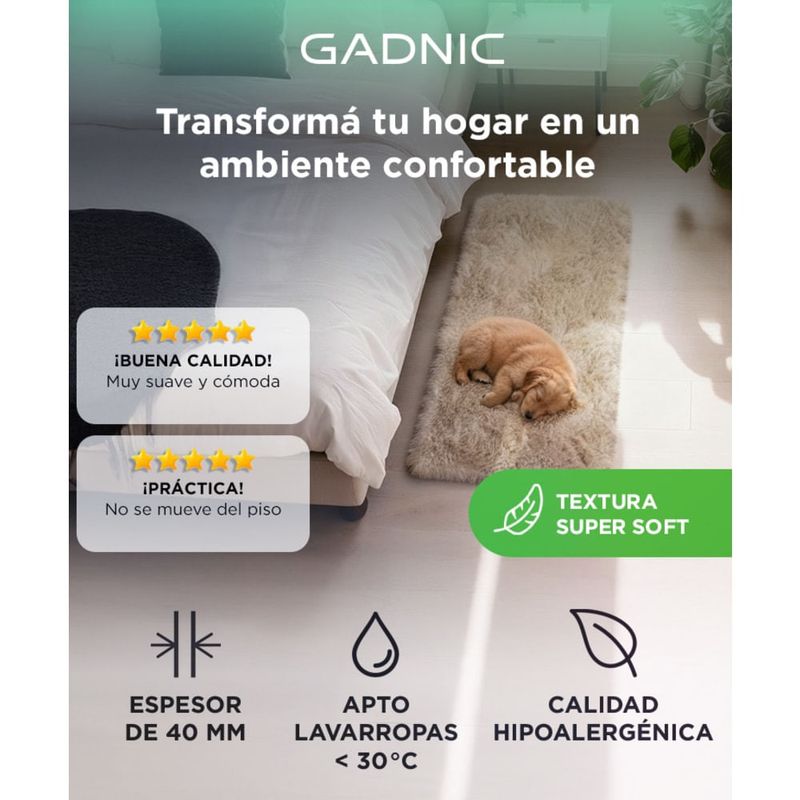 Superficie de poliéster aterciopelado con pelo largo tipo shaggy (38–40 mm). Brinda suavidad extrema y amortiguación en cada paso, ideal para living, dormitorio o cuartos infantiles.
