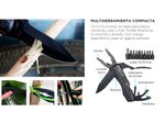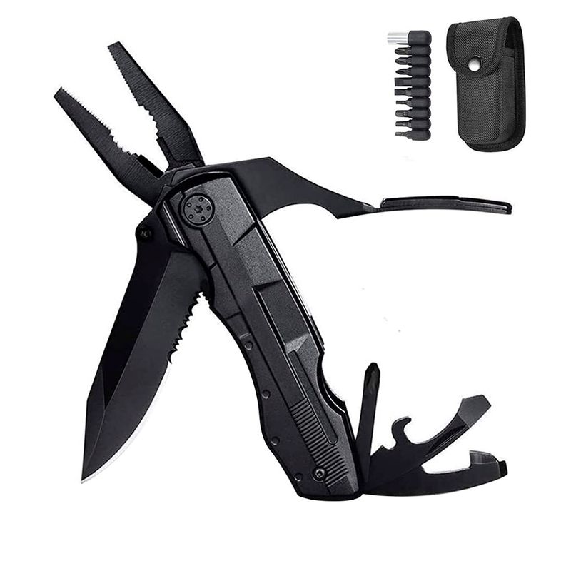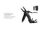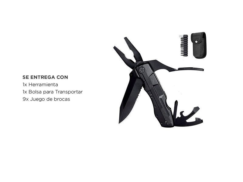Funciones: cuchillo de punta dentada, abrazadera, alicates comunes, corta-alambres, destornillador ranurado, abrelatas, abrebotellas, destornillador, adaptador de punta + juego de destornilladores 9 en 1.