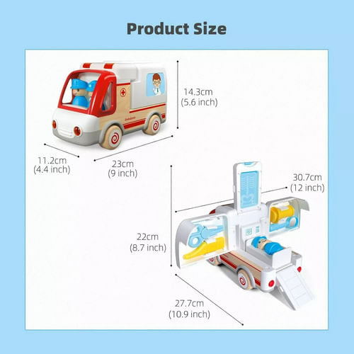 Incluye 2 muñecos de madera y accesorios como tijera, inyección, termómetro y espejo.