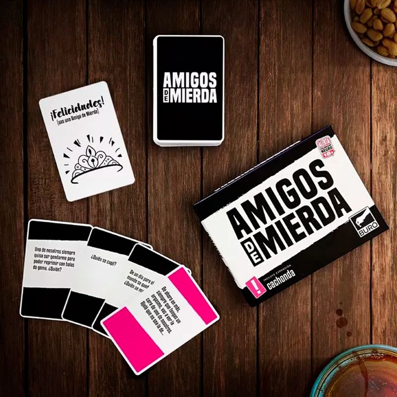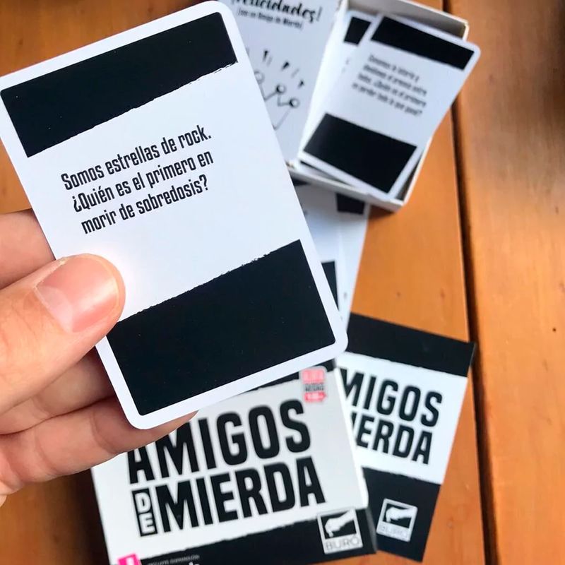 En Amigos de Mierda va a ganar el peor de ustedes ¡Pero lo van a señalar los demás! En cada ronda las cartas te van a preguntar, por ejemplo: En un apocalipsis zombie ¿cual de tus amigos sería el primero en morir? y a la cuenta de 3 todos deben señalar a alguien, el que sea elegido por la mayoría 5 veces ¡gana el juego!