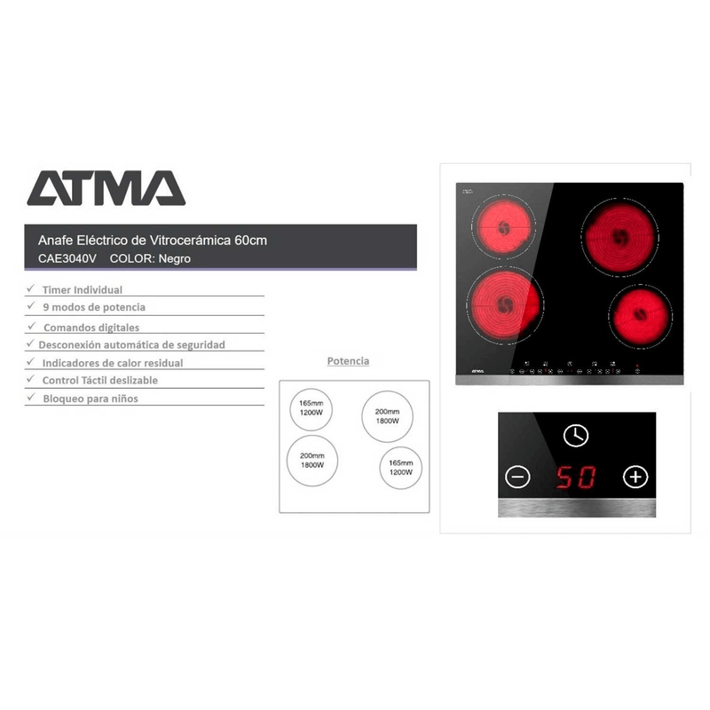 Anafe Vitroceramico Atma CAE3040V de 4 Hornallas Digital