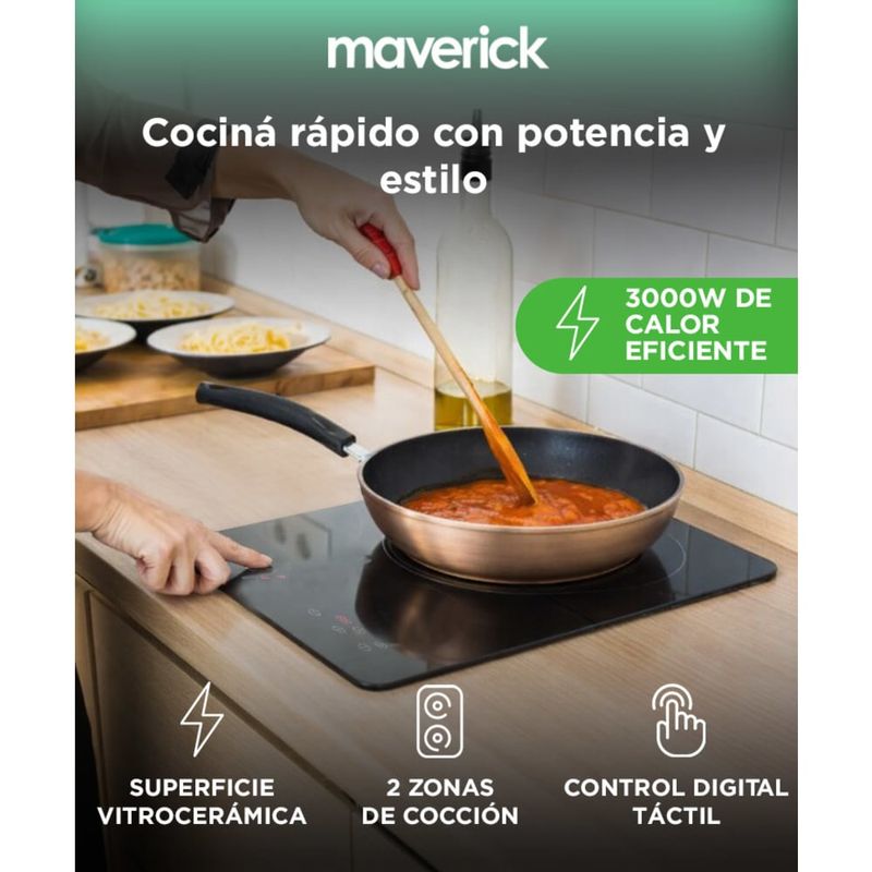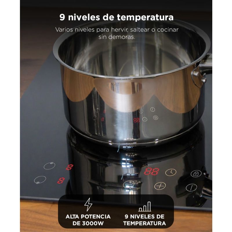 Potencia 3000W con doble zona activa: Cociná más rápido y sin interrupciones con calor eficiente y constante.