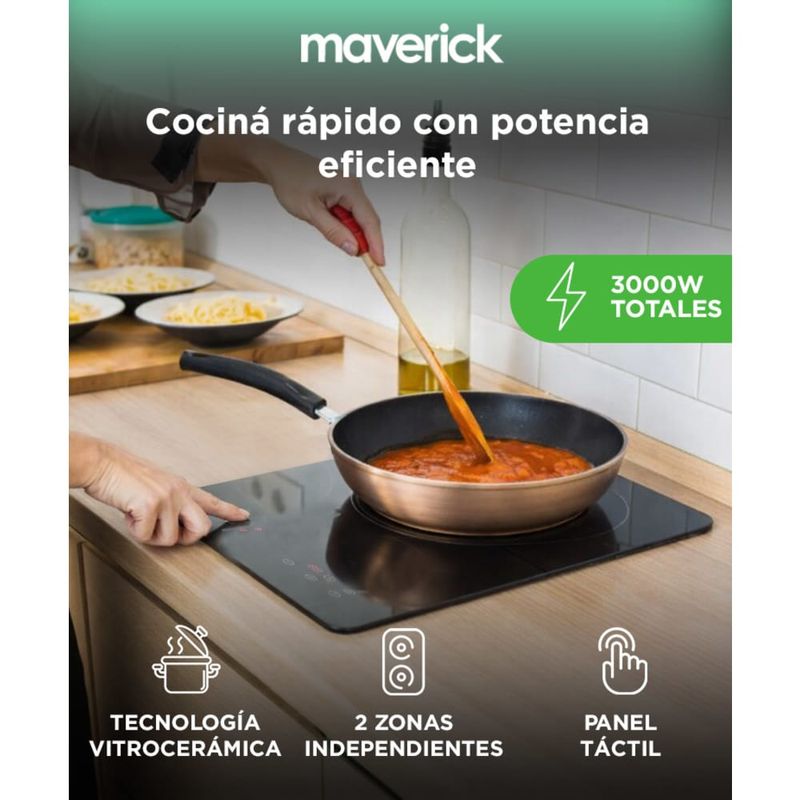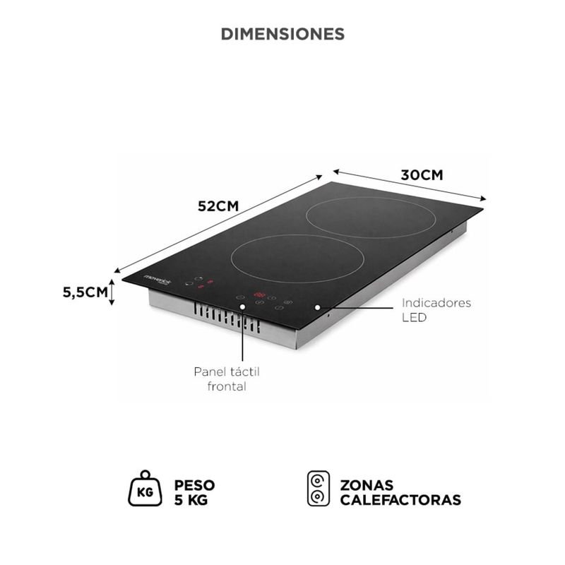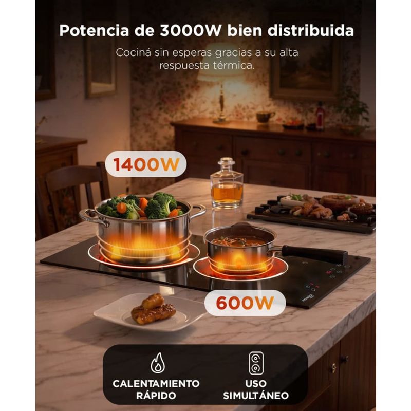 Potencia distribuida para cocinar sin esperas: 3000W totales bien aprovechados en 2 zonas de cocción.