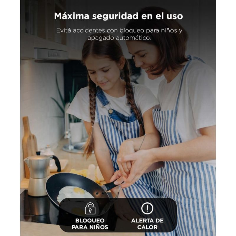 Seguridad completa: Bloqueo para niños, apagado automático e indicador de calor.