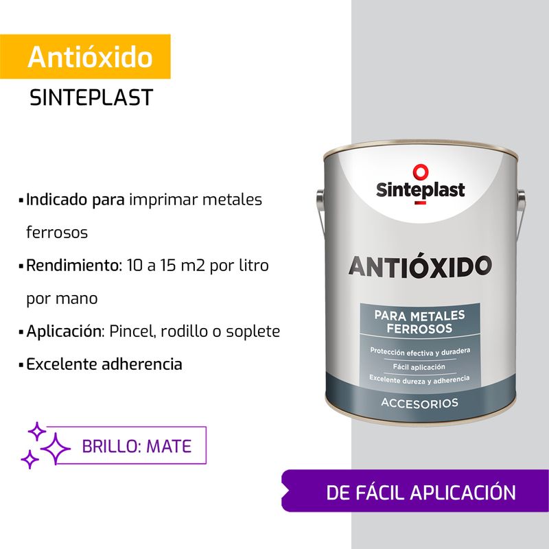 Indicado para imprimar metales ferrosos, cuyos componentes anticorrosivos actúan evitando por mucho tiempo la oxidación, como así también demorando el avance de la corrosión preexistente.