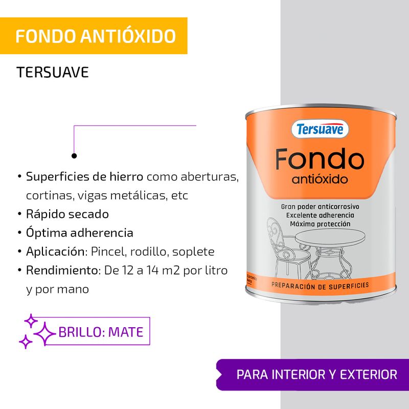 Tersuave Fondo Antióxido, es un producto de gran poder anticorrosivo, que asegura una máxima protección sobre superficies ferrosas. Previene la corrosión brindando una excelente adherencia.