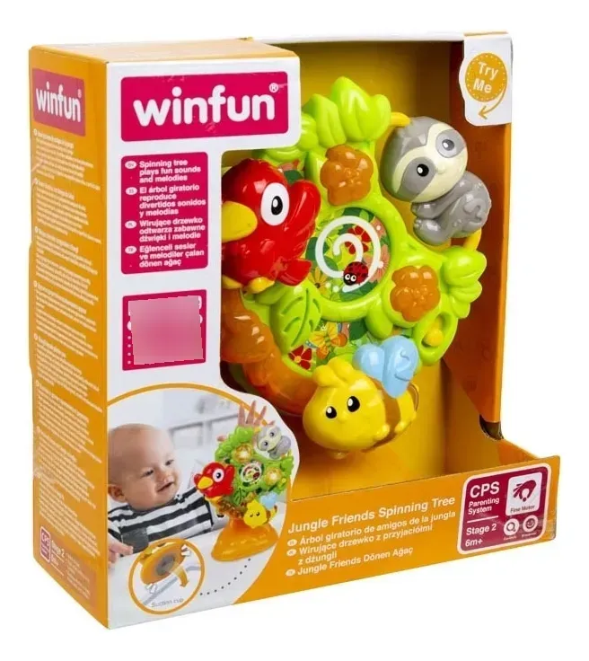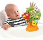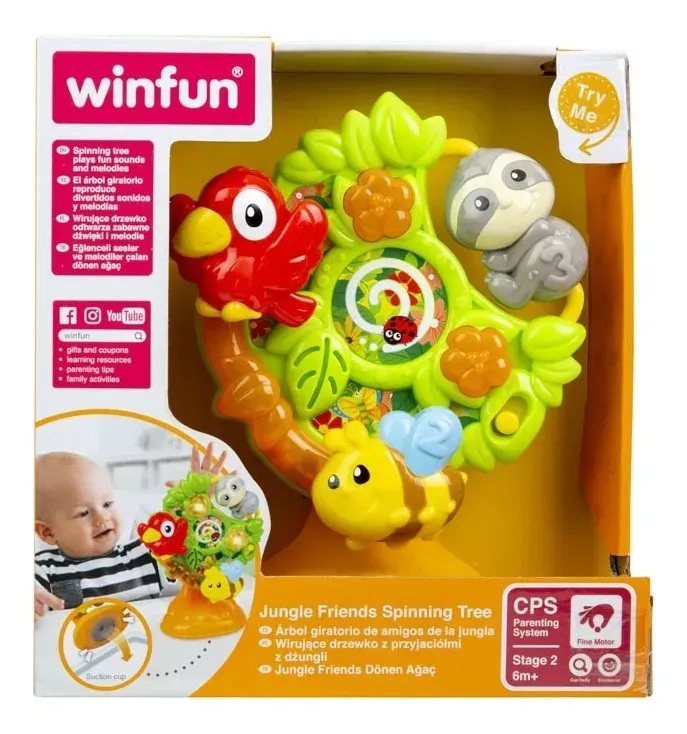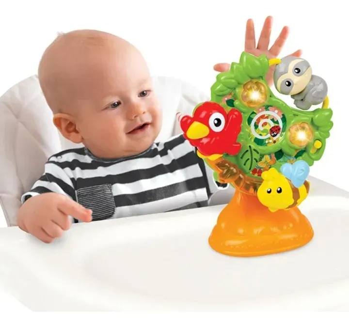 Árbol giratorio interactivo con amigables amigos de la jungla. Gira el árbol para escuchar sonidos divertidos, melodías y luces intermitentes. Desliza al simpático perezoso y haz girar al descarado loro y a la ocupada abeja Pulsa el botón del loro y la abeja para ver luces y sonidos. La ventosa de sujeción rápida asegura fácilmente el juguete a una superficie plana y lisa, es perfecto para una mesa o una silla alta.