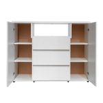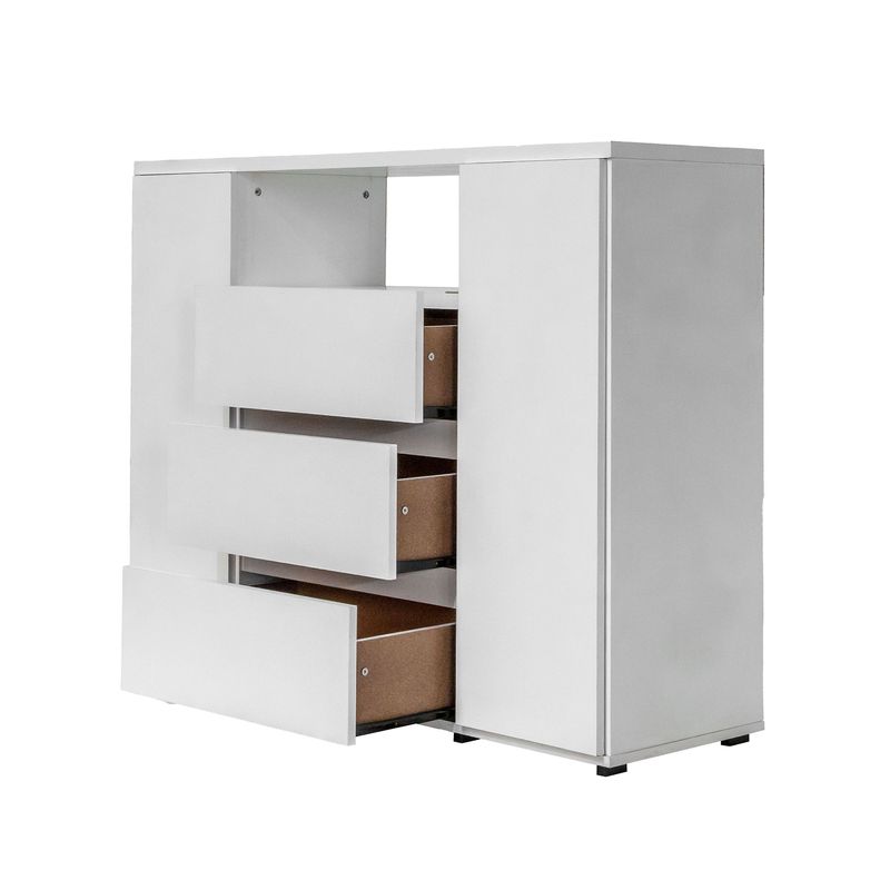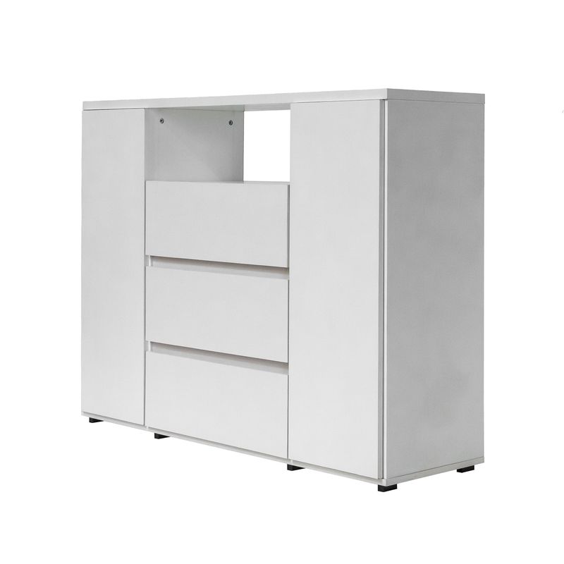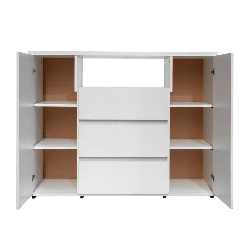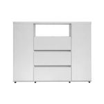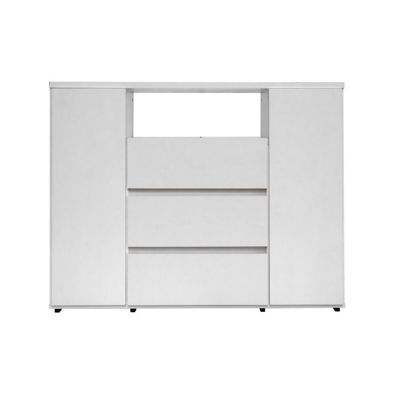 Multifunción de melamina, utilizable como cómoda, mesa de Tv o bahiut, con tres cajones con correderas metálicas, dos puertas, y cuatro estantes internos, y tiradores plásticos.