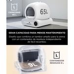 El arenero automático autolimpiable LDAC65 realiza ciclos de limpieza autónomos mediante pala motorizada, manteniendo la bandeja higiénica después de cada uso sin necesidad de limpieza manual constante.