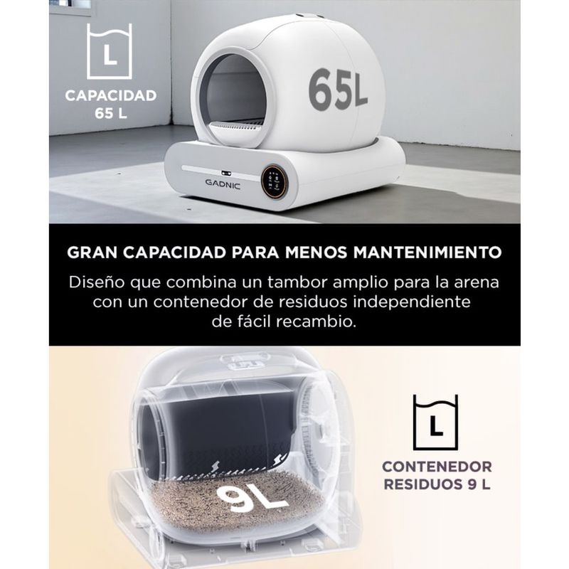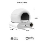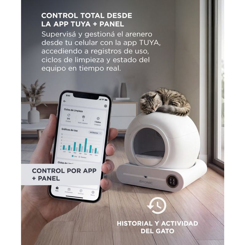 El arenero permite operar funciones desde el panel integrado o mediante la app TUYA, facilitando la limpieza manual, el recambio de arena y el control del funcionamiento diario.