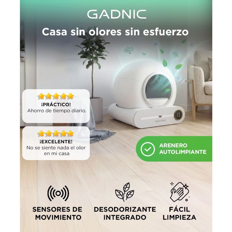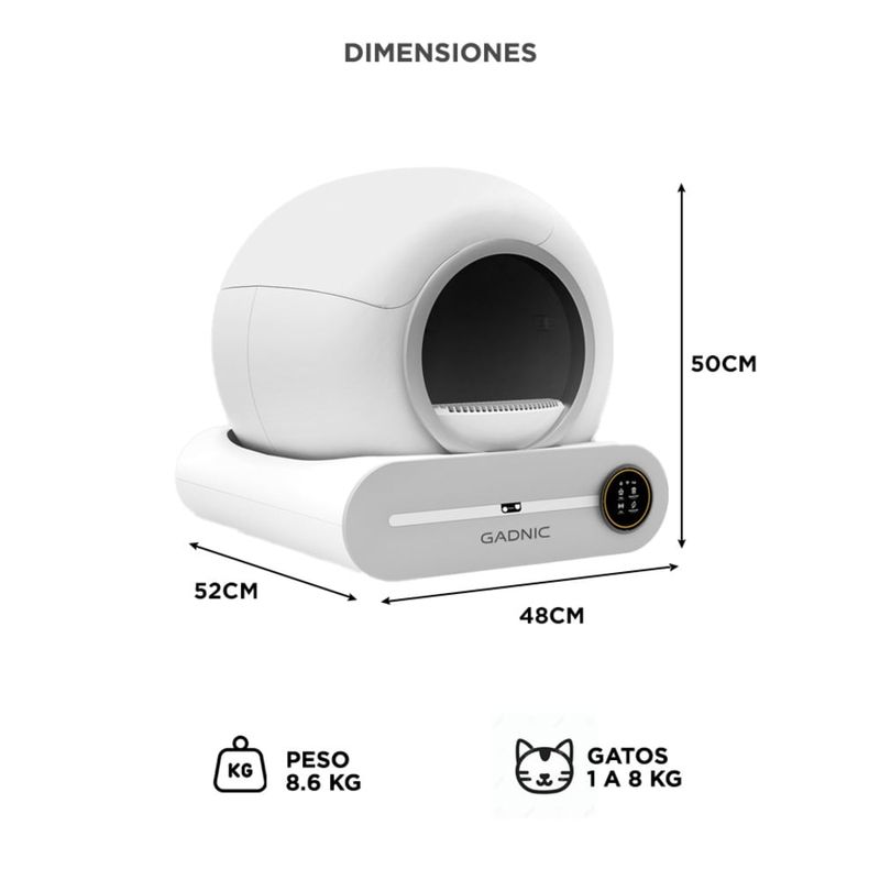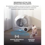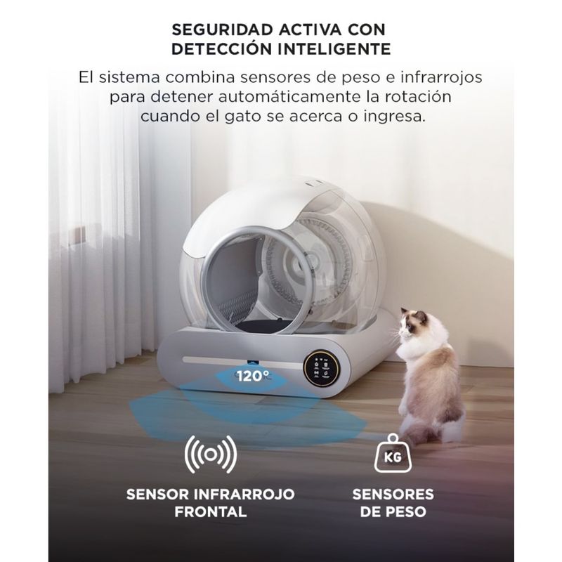 Integra sensores de peso e infrarrojos que detienen el funcionamiento al detectar la presencia del gato. Este sistema reduce el riesgo de atrapamiento y permite un uso seguro para gatos de 1 a 8 kg.