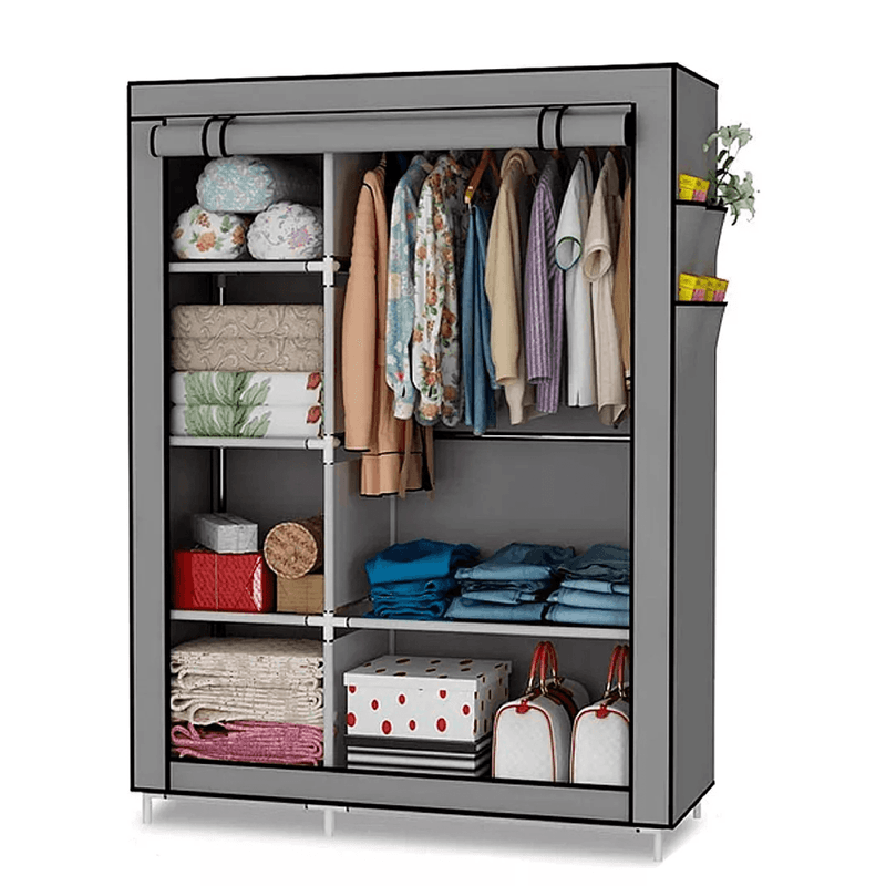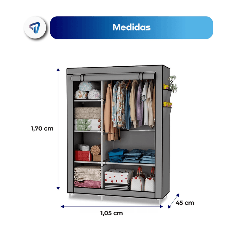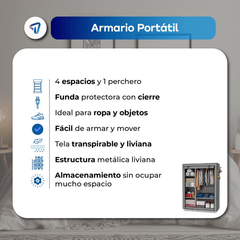 Armario portátil WAGGS ARPO05, práctico y resistente, ideal para organizar ropa, calzado y accesorios en espacios reducidos. Su diseño incluye 4 estantes y un sector con barra para colgar prendas, funda protectora con cierre frontal y estructura de tubos galvanizados fáciles de armar sin herramientas. Perfecto para mudanzas, ropa de temporada o almacenamiento auxiliar, combina funcionalidad, ligereza y versatilidad en cualquier ambiente.