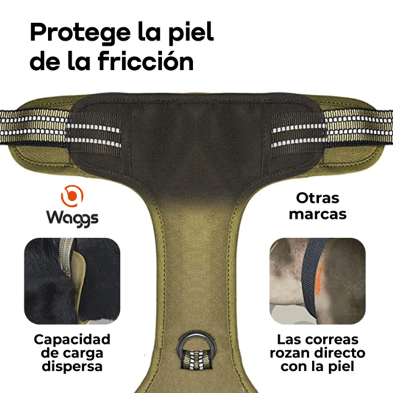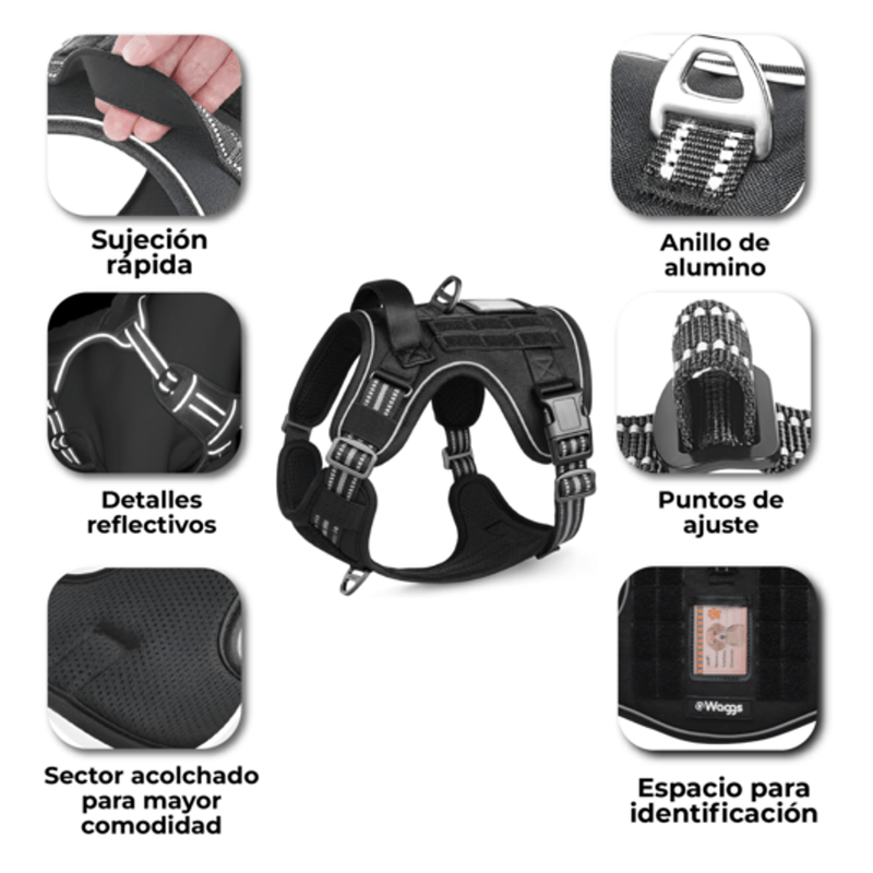 El arnés táctico para perro WAGGS está diseñado para brindar máximo control, comodidad y seguridad en paseos y entrenamientos diarios, adaptándose a perros pequeños, medianos y grandes. Su estructura reforzada con tejido acolchado y malla respirable protege la piel y asegura confort incluso en usos intensivos, mientras que el sistema antitirones con clip frontal y trasero permite un manejo firme y equilibrado. Incorpora hebilla lateral de cierre rápido tipo nesting para colocarlo en segundos, D-rings metálicos de alta resistencia y asa superior para control manual inmediato. El diseño reflectivo mejora la visibilidad nocturna y suma seguridad en entornos urbanos o con poca luz. Ajustable, resistente y funcional, es la opción ideal para quienes buscan durabilidad, control y estilo en un solo arnés. WAGGS acompaña cada salida con rendimiento y diseño pensado para tu perro.