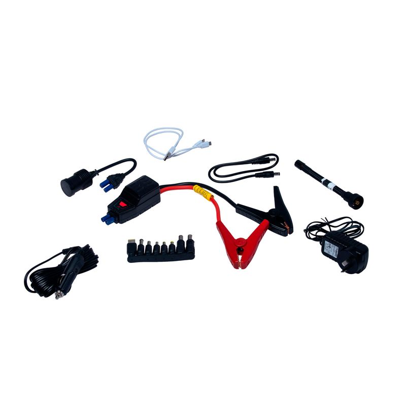 El kit incluye: adaptador 12V, Cable USB, accesorios 12V /19V, par de cocodrilos, cargador tradicional, cargador para auto, arrancador e inflador.