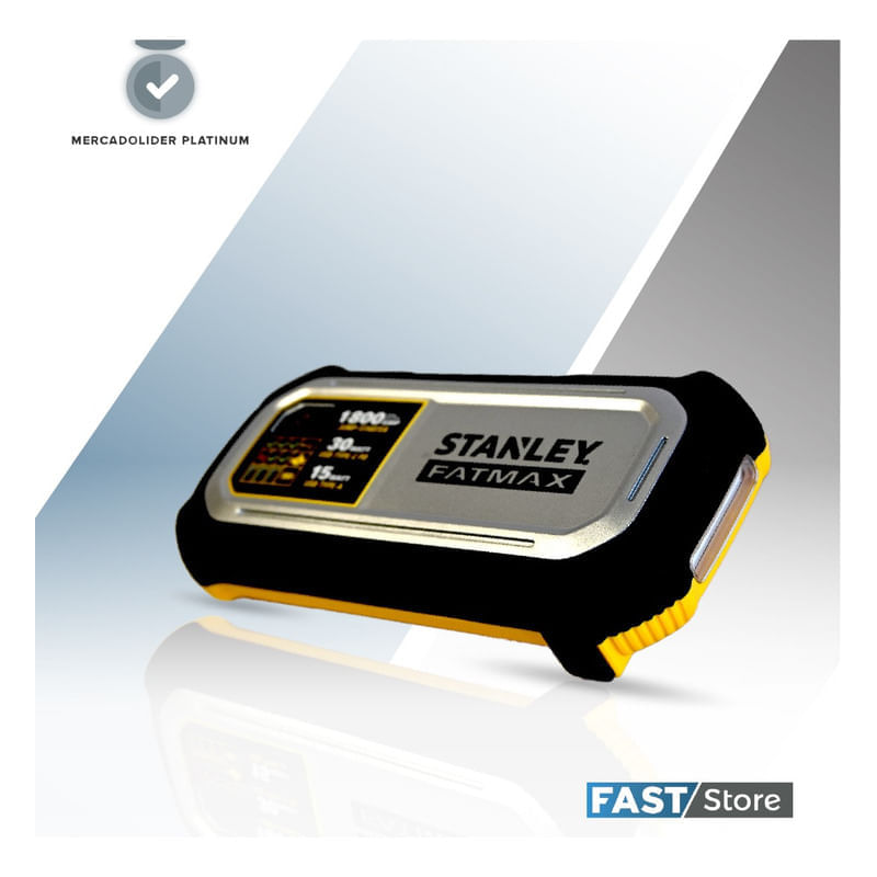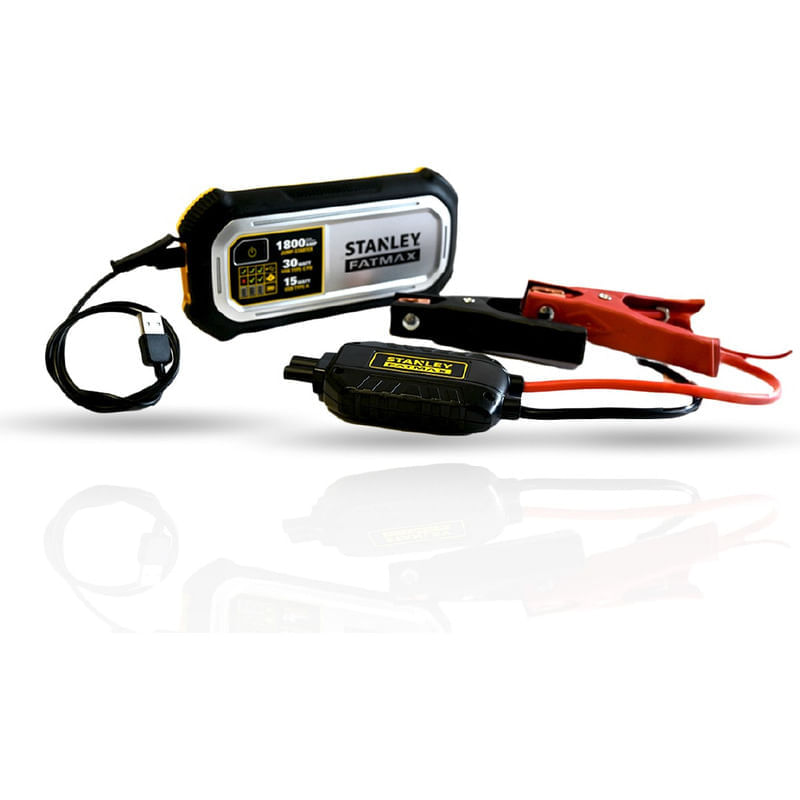 Arrancador portatil Stanley FatMax con 1800A pico. Ideal para autos y camionetas hasta 8 cilindros. Incluye power bank USB-C y USB-A, luz LED y proteccion contra polaridad inversa. Compacto y resistente, perfecto para emergencias y viajes.