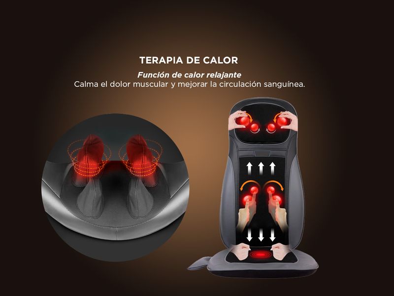 Cuenta con 3 modos de masaje: Rotación, Vibración, Terapia de Calor. Incluye Control remoto para personalizar el modo y área y funda lavable.
