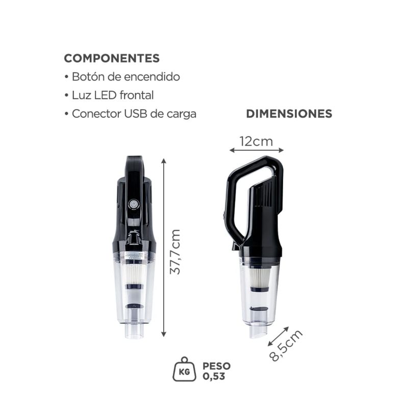 Inalámbrica y Compacta: Olvídate de los cables enredados. La aspiradora de mano inalámbrica te brinda total libertad de movimiento para acceder a todos los rincones de tu hogar sin restricciones. Su diseño compacto, con unas dimensiones aproximadas de 377 x 120 x 89mm y un peso de apenas 530g, la convierte en la elección perfecta para una limpieza rápida y eficiente.