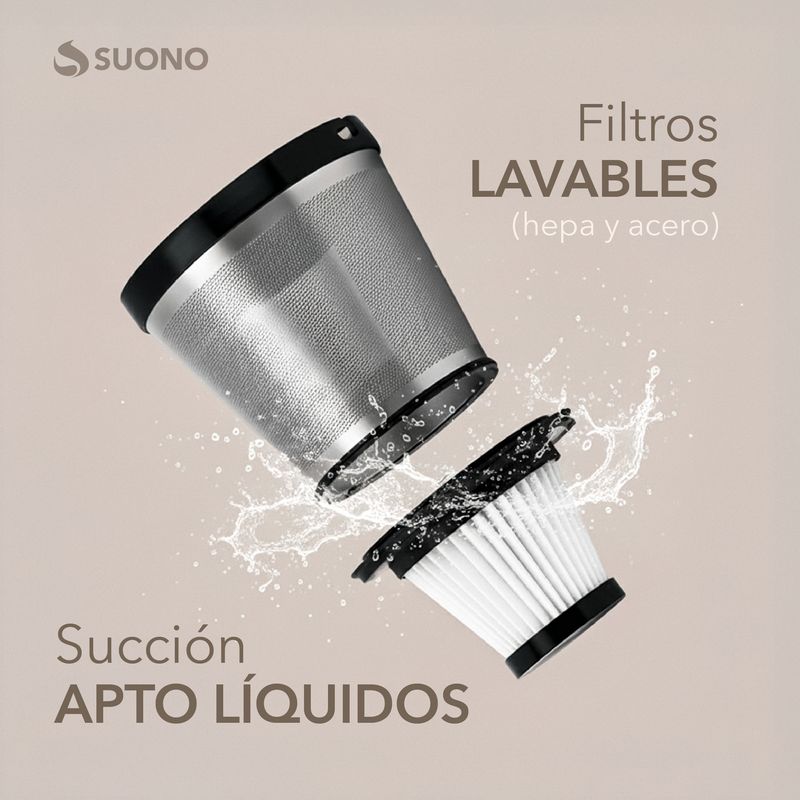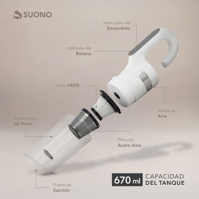 La Aspiradora de Mano Suono es ideal para limpiezas rápidas, con un rendimiento potente y sin cables. Su tecnología de succión apta para líquidos y su sistema de doble filtro garantizan resultados más limpios y saludables. Compacta, ligera y con batería recargable, se adapta a cualquier espacio y necesidad.