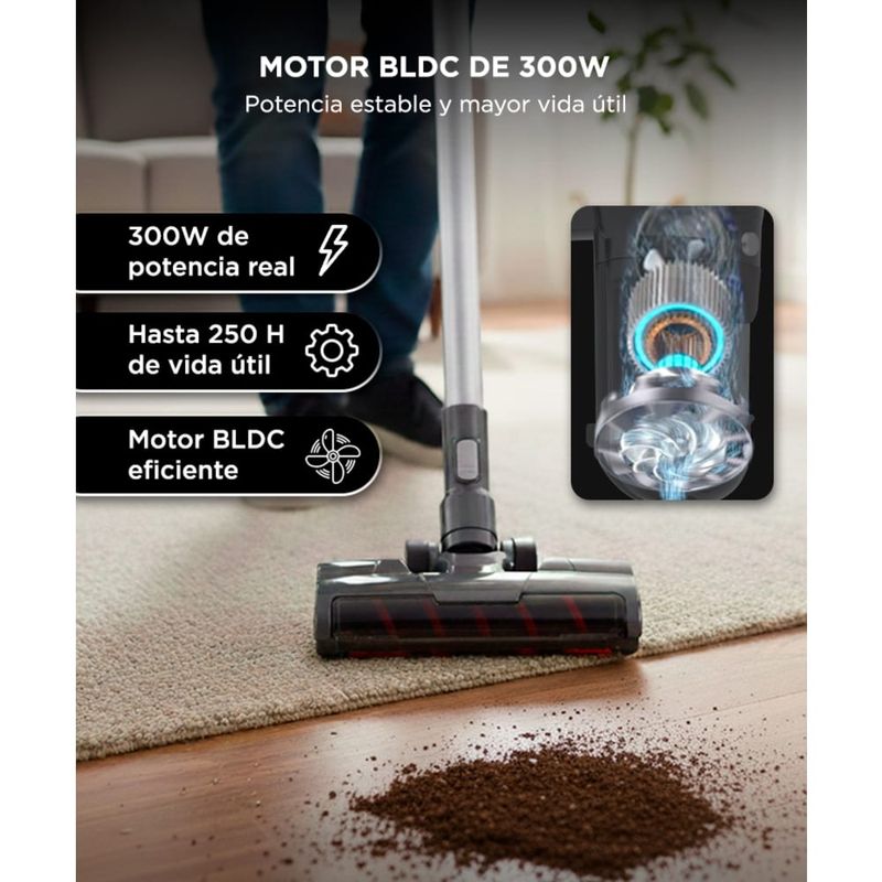 Su motor brushless ofrece mayor eficiencia, menos desgaste y una succión estable de 16 kPa para limpieza profunda en todo tipo de superficies.