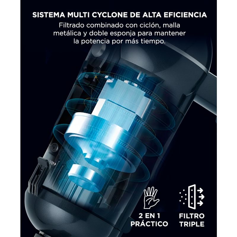 Combinación de ciclón, malla metálica y doble esponja que retiene partículas y evita pérdida de potencia a medida que se llena el depósito.