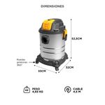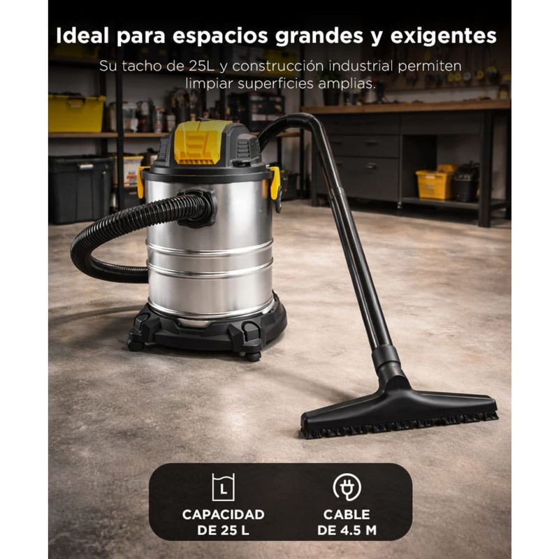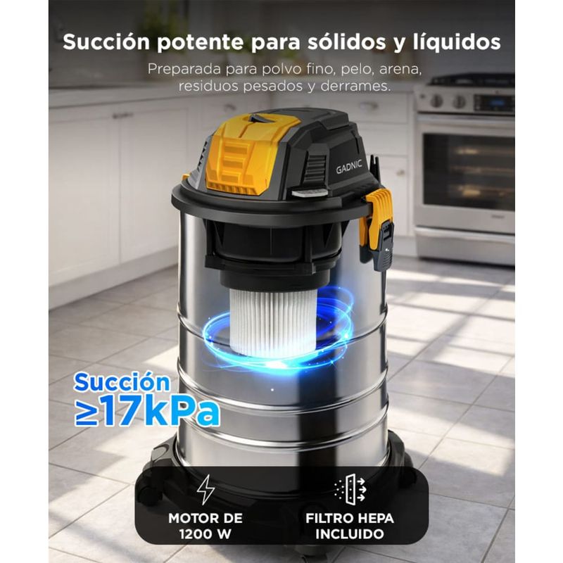 La Aspiradora de Tacho 25 L Gadnic MG500 cuenta con una potencia nominal de 1200 W y una vacuidad ?17 KPa, permitiendo aspirar polvo fino, escombros y suciedad pesada con resultados consistentes.