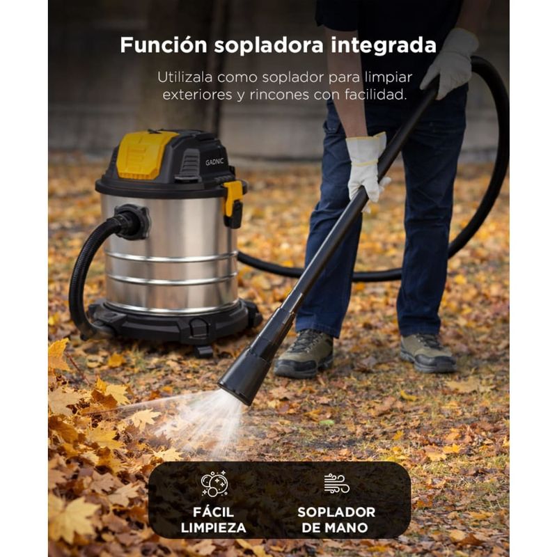 Diseñada para adaptarse a múltiples situaciones, permite aspirar sólidos y líquidos, además de funcionar como sopladora para limpiar hojas, rincones o zonas de difícil acceso.