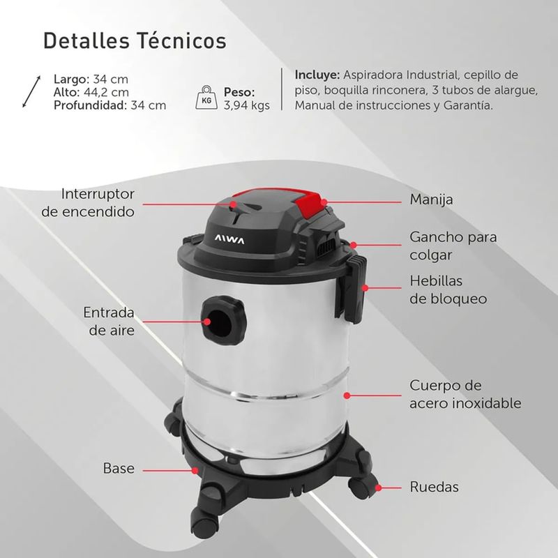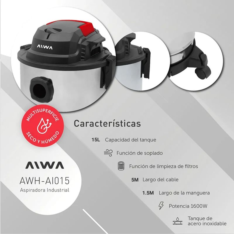 La aspiradora industrial Aiwa AWH-AI015 es la aliada definitiva para quienes buscan potencia real y durabilidad en un solo equipo. Equipada con un motor de 1600W y una impresionante fuerza de succión de 18kPa, esta herramienta está diseñada para enfrentar sin esfuerzo los desafíos más exigentes, ya sea en talleres, oficinas o grandes superficies del hogar. Su robusto tanque de 15 litros, fabricado en acero inoxidable, no solo le otorga una estética profesional y elegante, sino que garantiza una resistencia superior al uso intensivo, asegurando que tu inversión te acompañe impecable por mucho tiempo.