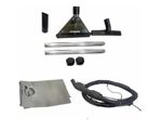 Incluye cepillo para tapicería, manguera flexible y boquillas múltiples para suelos y esquinas, todo se guarda en el porta-accesorios del equipo.