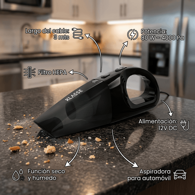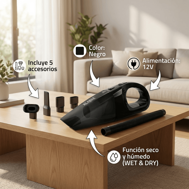 - Gracias a su alimentación de 12V con conexión directa al encendedor o a la entrada 12V de tu vehículo, esta aspiradora es perfecta para usar en cualquier momento, sin depender de baterías ni recargas. Su motor potente garantiza una succión efectiva para eliminar polvo, migas, tierra y suciedad acumulada en alfombras, asientos y tapizados.
