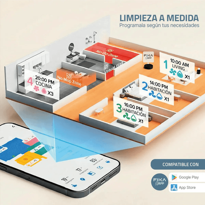 La FIKA ORBITAL es la evolución de la limpieza autónoma. A diferencia de los robots básicos que chocan y limpian al azar, la Orbital utiliza Mapeo en Tiempo Real: crea un mapa digital de tu casa en la APP para limpiar de forma estratégica, cubriendo el 100% de la superficie sin repetir zonas ni olvidar rincones.
