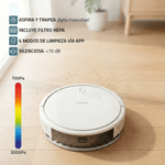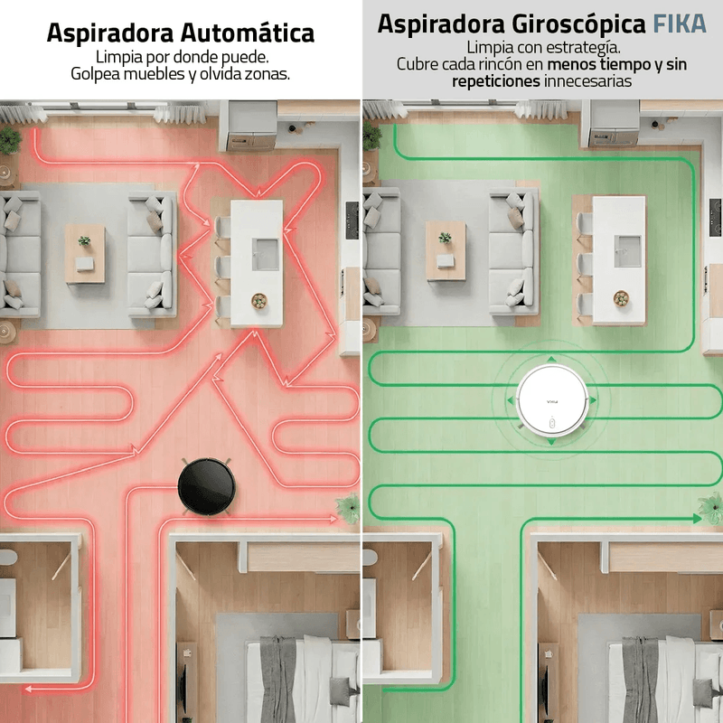 FIKA NEXOS(Giroscópico): Utiliza sensores inteligentes para mapear tu hogar y limpiar con un patrón en zigzag. Esto asegura que cubra el 100% de la superficie en menos tiempo, de forma ordenada y eficiente.