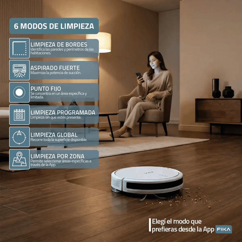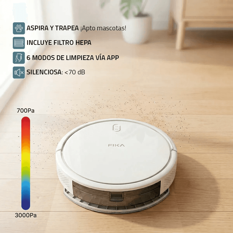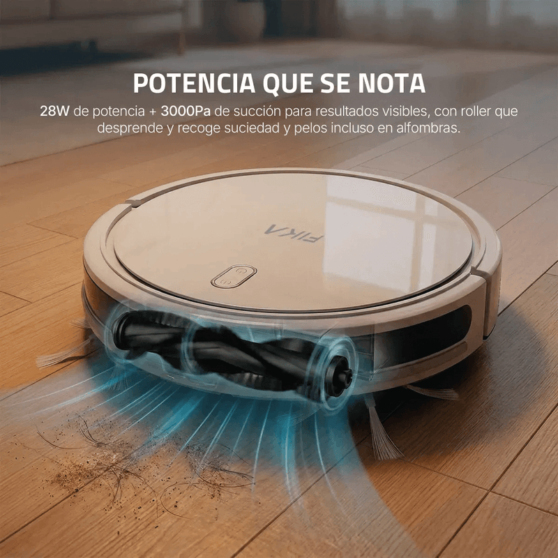 La Aspiradora Robot FIKA NEXOS combina potencia y tecnología de precisión para una limpieza total. A diferencia de otros modelos, este robot se gestiona desde la APP FIKA oficial, desarrollada exclusivamente para nuestros productos, garantizando una conexión más estable, actualizaciones dedicadas y una interfaz intuitiva.