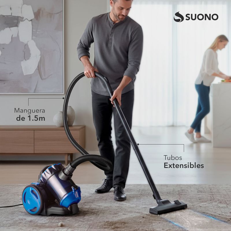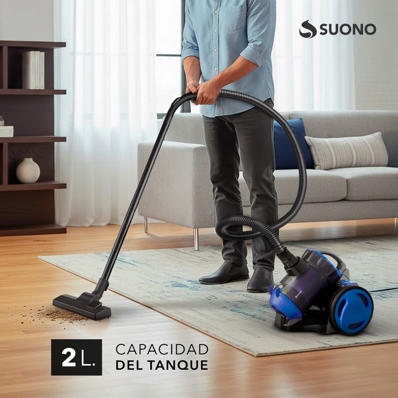 La Aspiradora Trineo Ciclónica Suono sin Bolsa de 880W combina un diseño moderno, gran capacidad de succión y tecnología ciclónica avanzada para ofrecer una limpieza profunda, constante y sin interrupciones. Su sistema sin bolsa y su depósito reutilizable de 2 L hacen que el mantenimiento sea rápido y económico, mientras que su estructura compacta facilita su almacenamiento y transporte.