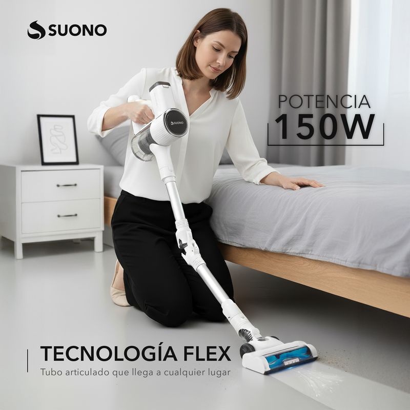 La Aspiradora Vertical Suono Flex 150W redefine la limpieza del hogar gracias a su diseño articulado y flexible, que permite acceder fácilmente a rincones, debajo de los muebles y lugares difíciles. Con su batería recargable y potente motor, ofrece un rendimiento óptimo sin cables, combinando eficiencia, comodidad y tecnología avanzada.