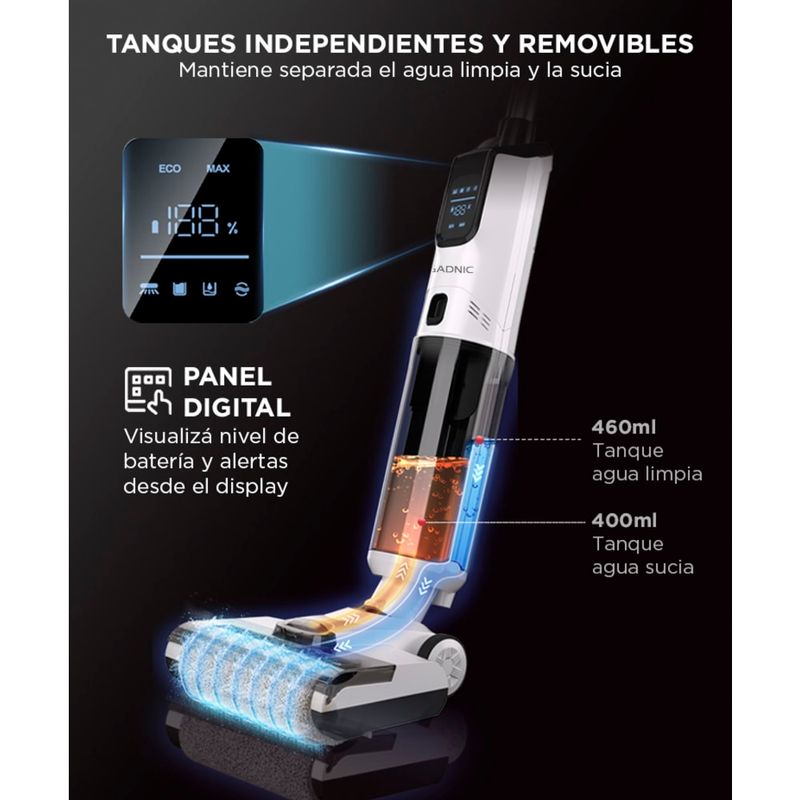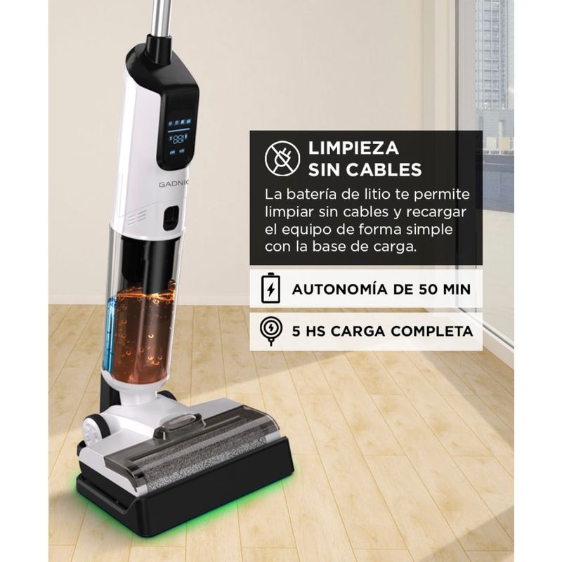 Aspirá y fregá al mismo tiempo con un solo equipo. Ideal para mantener pisos de madera, cerámica o alfombras finas impecables todos los días.