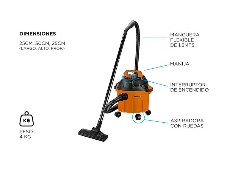 La aspiradora Winco W530 es una solución versátil para la limpieza en el hogar u oficina. Con capacidad para polvo y líquidos, esta aspiradora de 10 litros es ideal para diferentes tipos de tareas de limpieza. Además, cuenta con una función de sopladora que puede ser útil para eliminar el polvo en áreas de difícil acceso. Su diseño incluye diversos accesorios que permiten adaptarse a distintas superficies y necesidades de limpieza.