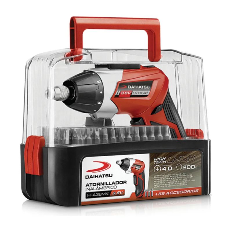Disfrutá el Atornillador Inalámbrico Daihatsu 3,6V con kit de 55 mechas, maletín, luz LED y batería de larga duración. ¡Optimizá tus trabajos hoy!