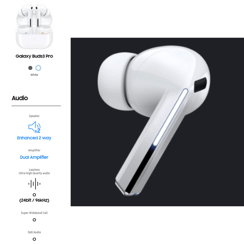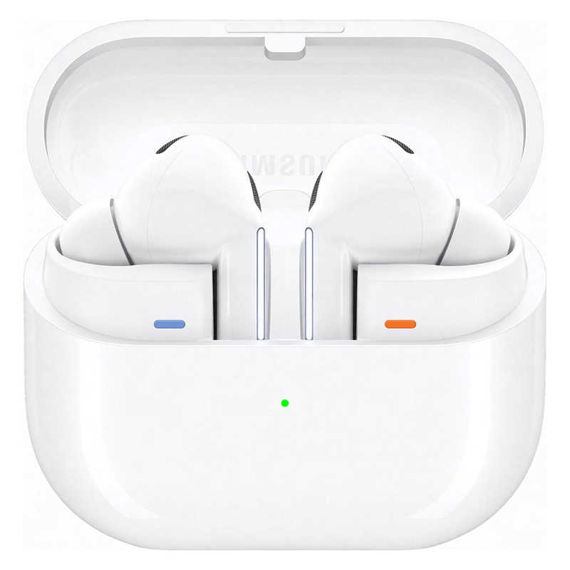 Auriculares inalámbricos Samsung Galaxy Buds 3 Pro color blanco con cancelación activa de ruido adaptativa y sonido Hi-Fi. Incluyen funciones con Galaxy AI como ecualización adaptativa, traducción en tiempo real y modo 360 Audio. Batería de larga duración con hasta 30 horas totales, certificación IP57 y conectividad Bluetooth 5.4. Diseño ergonómico con tallo, controles táctiles y estuche compacto.