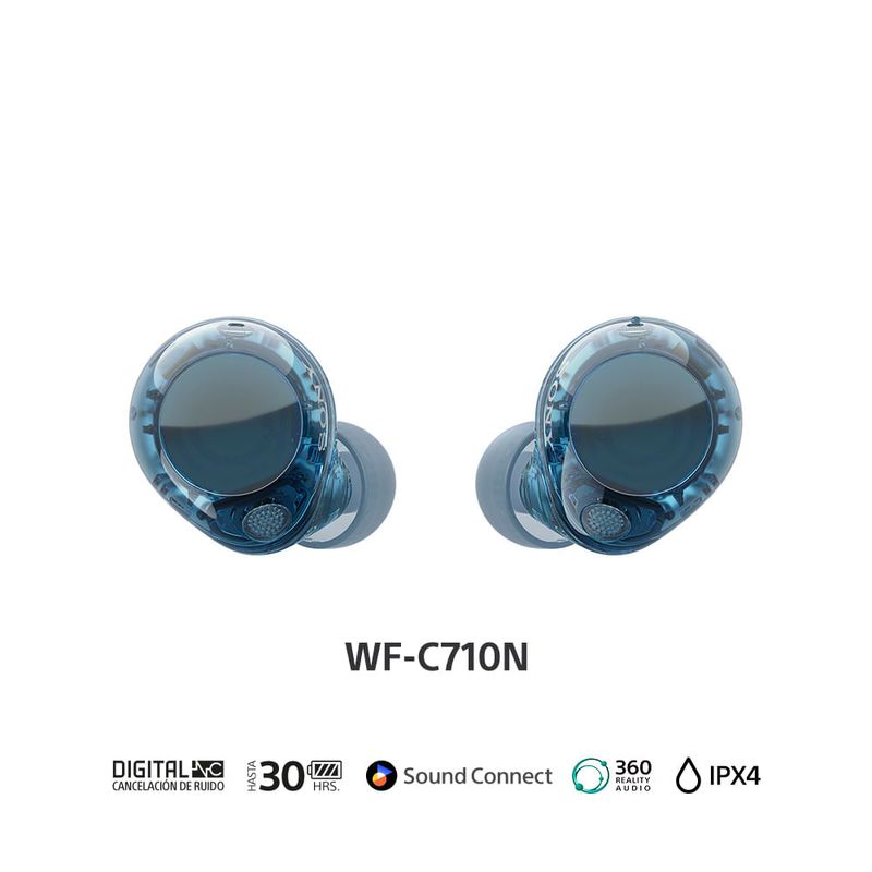 Sumérgete en el sonido con Noise CancellingLos micrófonos duales mejoran la función de Noise Cancelling de los WF-C710N al ayudar a detectar el ruido circundante y reducir la degradación del rendimiento debido a variaciones de ajuste individuales. Cambia al modo de sonido ambiental y disfrutarás de una experiencia de audio natural sin desconectarte del entorno.Tecnología de sensor de ruido con micrófonos dualesCon Noise Cancelling avanzado, los auriculares WF-C710N pueden aislarte del mundo que te rodea y permitirte disfrutar más de tu música. El sensor de ruido dual filtra el sonido exterior mediante dos micrófonos, por lo que lo único que escuchas es tu música.Silencia el vientoUna estructura de reducción de ruido del viento alrededor del micrófono reduce las distracciones cuando estás activo al aire libre y te permite concentrarte en tu música favorita.Sonido ambiente más natural y ajustableEn el modo de sonido ambiente, los auriculares WF-C710N captan mejor el sonido ambiente que te rodea gracias a los micrófonos de alimentación y retroalimentación, para que disfrutes de una experiencia de audio natural mientras mantienes la conexión con tu entorno. Además, la app Sony | Sound Connect te permite ajustar el sonido ambiente en 20 niveles o utilizar la configuración Transferencia de voz para conversar sin quitarte los auriculares.El control de sonido adaptativo se ajusta automáticamente a lo que hagasEl control de sonido adaptativo es una función inteligente que detecta dónde estás y qué estás haciendo para crear la experiencia de audio ideal en función del sonido ambiente. Incluso reconoce los lugares que visitas con frecuencia, como tu lugar de trabajo, el gimnasio o tu cafetería favorita, y cambia el modo de sonido según la situación.Batería, llamadas, lo que necesitas todos los díasBatería duradera para un uso diario sin complicacionesDiseñados para usarlos cómodamente todo el día. La mayor duración de la batería significa que puedes disfrutar de hasta 8,5 horas en tus auriculares y otras 21,5 horas en el estuche. Eso equivale a 30 horas completas de escucha cuando están completamente cargados00. Y con la carga rápida de 5 minutos, puedes recargarlos rápidamente para obtener una hora adicional.Llamadas nítidasCon la tecnología Precise Voice Pickup, que controla los micrófonos dentro y fuera del tapón, y al procesamiento de señal de audio, las conversaciones son muy claras, incluso en entornos ruidosos. Nuestro algoritmo de reducción de ruido se desarrolló con IA que utiliza más de 500 millones de muestras de voz para eliminar el ruido ambiental y extraer tu voz con claridad.Llamadas con manos libres de forma sencillaLa conversación fluye con la función de llamadas con manos libres, ahora más nítida con el micrófono integrado de alta calidad. No tendrás que sacar el teléfono del bolsillo.Muchas formas de usarLos WF-C710N ofrecen un sonido de alta calidad, tanto si estás escuchando música como si estás en una clase en línea o trabajando desde casa.Sonido sin concesiones en cada canciónUna calidad de sonido que amarásGracias a nuestra sintonización de sonido única y a nuestra unidad de diafragma de 5 mm, obtendrá graves potentes y una calidad vocal clara. Está bien equilibrado, con voces claras y naturales. Esto significa que puedes disfrutar de una amplia gama de géneros musicales.Que tu música suene más naturalCuando una fuente de música original está comprimida, pierde elementos de alta frecuencia que agregan detalle a una canción. Nuestro Digital Sound Enhancement Engine (DSEE™) los restaura con fidelidad para producir un sonido de alta calidad más cercano a la grabación original.El sonido que a ti te gustaAdapta el sonido a tus preferencias. Elige entre una variedad de ajustes preestablecidos que coincidan con el género de música que estás escuchando y guarda tus propios ajustes preestablecidos usando la función de ecualización personalizada en la aplicación Sony¦Sound Connect.Auriculares certificados para una mejor experiencia personalizadaAnaliza la forma de tu oreja para optimizar tu experiencia con los auriculares certificados para 360 Reality Audio y la app Sony | Sound Connect, y sumérgete en la experiencia musical definitiva0.360 Spatial Sound PersonalizerCon la app Sony | 360 Spatial Sound Personalizer0, disfrutarás de una experiencia de sonido optimizada para ti. La app captura y analiza la forma de tu oreja para que los auriculares creen tu propio campo de sonido espacial cuando se emparejan con televisores BRAVIA™0. Simples, pero sofisticadosColores que no pasan de moda y que se adaptan a tu estiloCon un diseño naturalmente elegante y compacto y cuatro colores atemporales, que incluyen un azul transparente nuevo de claridad cristalina, junto con rosa, blanco y negro, para darle un toque de belleza a tu día0.Grandes características, tamaño pequeñoLos auriculares WF-C710N tienen todas las funcionalidades que necesitas, incluidos micrófonos adicionales para un mejor Noise Cancelling. Al mismo tiempo, son ligeros, fáciles de llevar y cómodos. La forma redondeada sin bordes los hace cómodos para orejas de todos los tamaños.Superficie con diseño ergonómicoUna forma que se adapta perfectamente al oído humano con una superficie ergonómica se diseñó especialmente para un ajuste más estable. Diseñados con datos de formas de oídos recopilados desde la aparición de los auriculares internos en 1982 y con evaluaciones de la sensibilidad de los diversos tipos a fin de garantizar una forma ideal y cómoda para muchas personas.Son ligeros y caben en tu bolsilloEl estuche de carga cilíndrico es pequeño y liviano, lo que hace que sea más fácil llevarlo en un bolsillo o bolso pequeño. La textura con patrón geométrico en la superficie exterior del estuche es elegante y, al mismo tiempo, práctica para facilitar la extracción del estuche.Control con un toqueReproduce, detén,